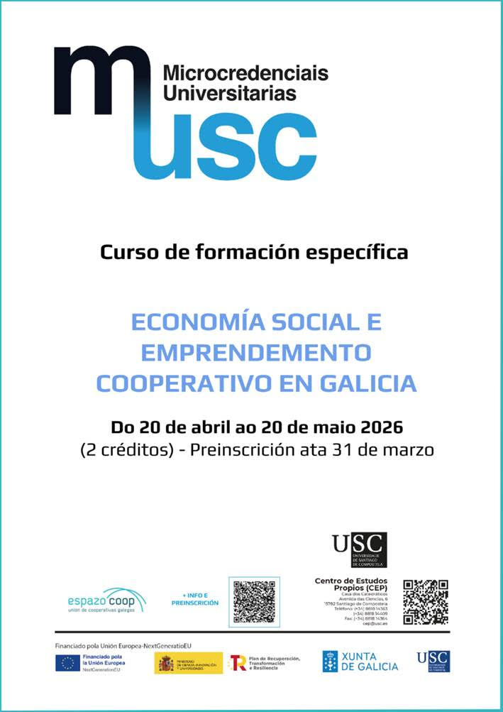 Dende a Unión de Cooperativas Galegas EspazoCoop, en colaboración coa Universidade de Santiago de Compostela, lánzase a Microcredencial Universitaria en Economía Social e Emprendemento Cooperativo en Galicia, unha nova proposta formativa dirixida a persoas interesadas en coñecer e explorar o cooperativismo como alternativa de emprendemento e desenvolvemento profesional.