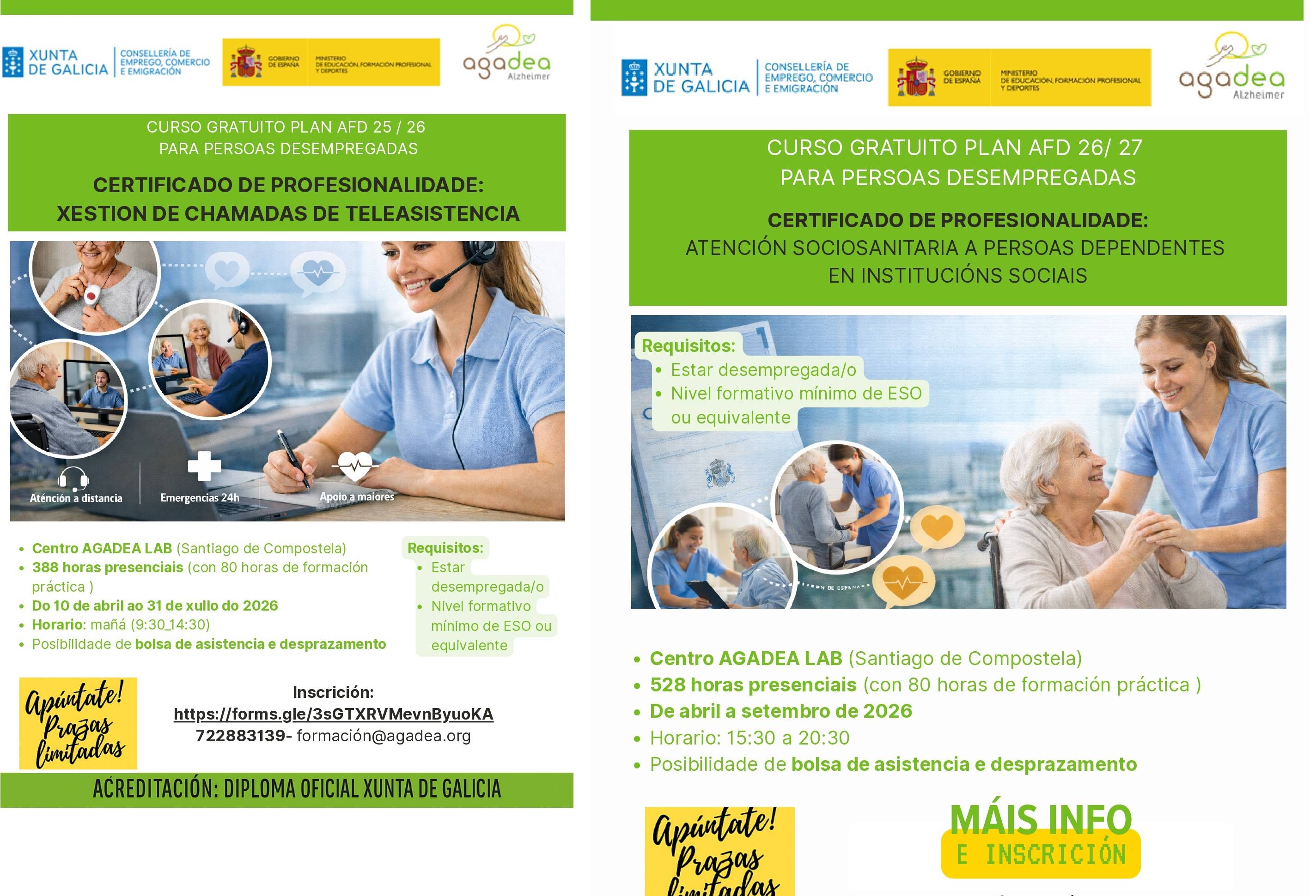 AGADEA ALZHEIMER vai iniciar no mes de ABRIL de 2026 dentro do plan AFD 2026_2027 financiado pola Xunta de Galicia e o Ministerio de Educación, Formación Profesional e Deportes os CERTIFICADOS DE PROFESIONALIDADE no ámbito sociosanitario.